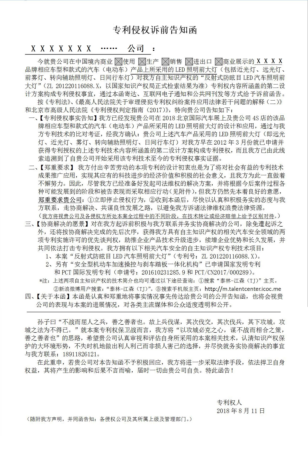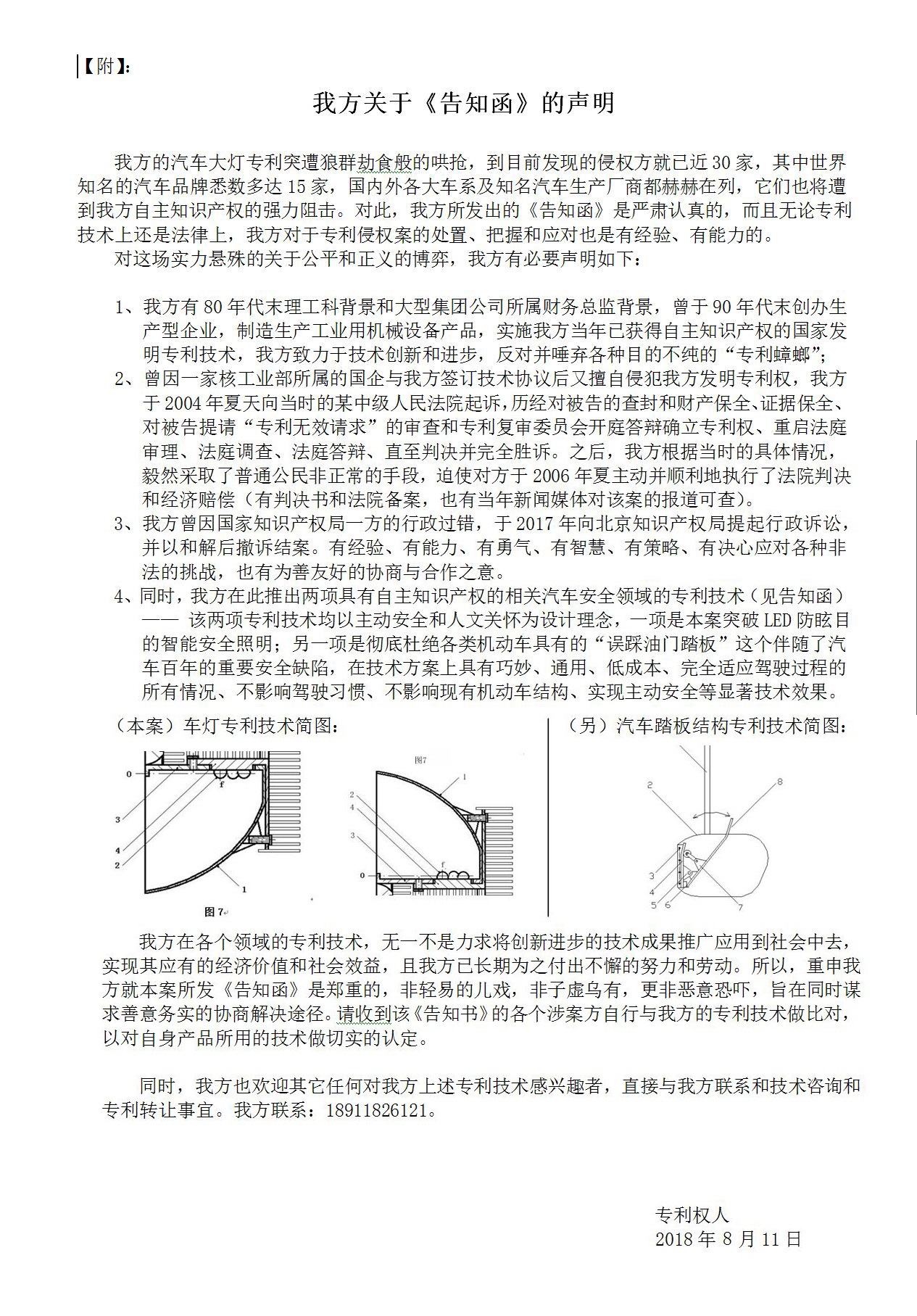 1本案所指的项目,系我方的“反射式防眩目LED汽车照明前大灯”专利(专利号:201220116088.X),是自20123月至今在中国大陆境内受专利保护的。就当前证据来看,该专利侵权案件规模涉及被告侵权方为在中国境内非法商业使用、生产、销售和进出口的30多家国内外知名汽车生产厂商,是国内外知名品牌的高档汽车、新能源车、摩托车和电动自行车产品(包括进口车、合资车、国内自主品牌车);关于侵权时间,我方也已有证据追溯发现他们有的从2016北京车展就开始陆续侵权获利,直到现在还在进行着侵权。